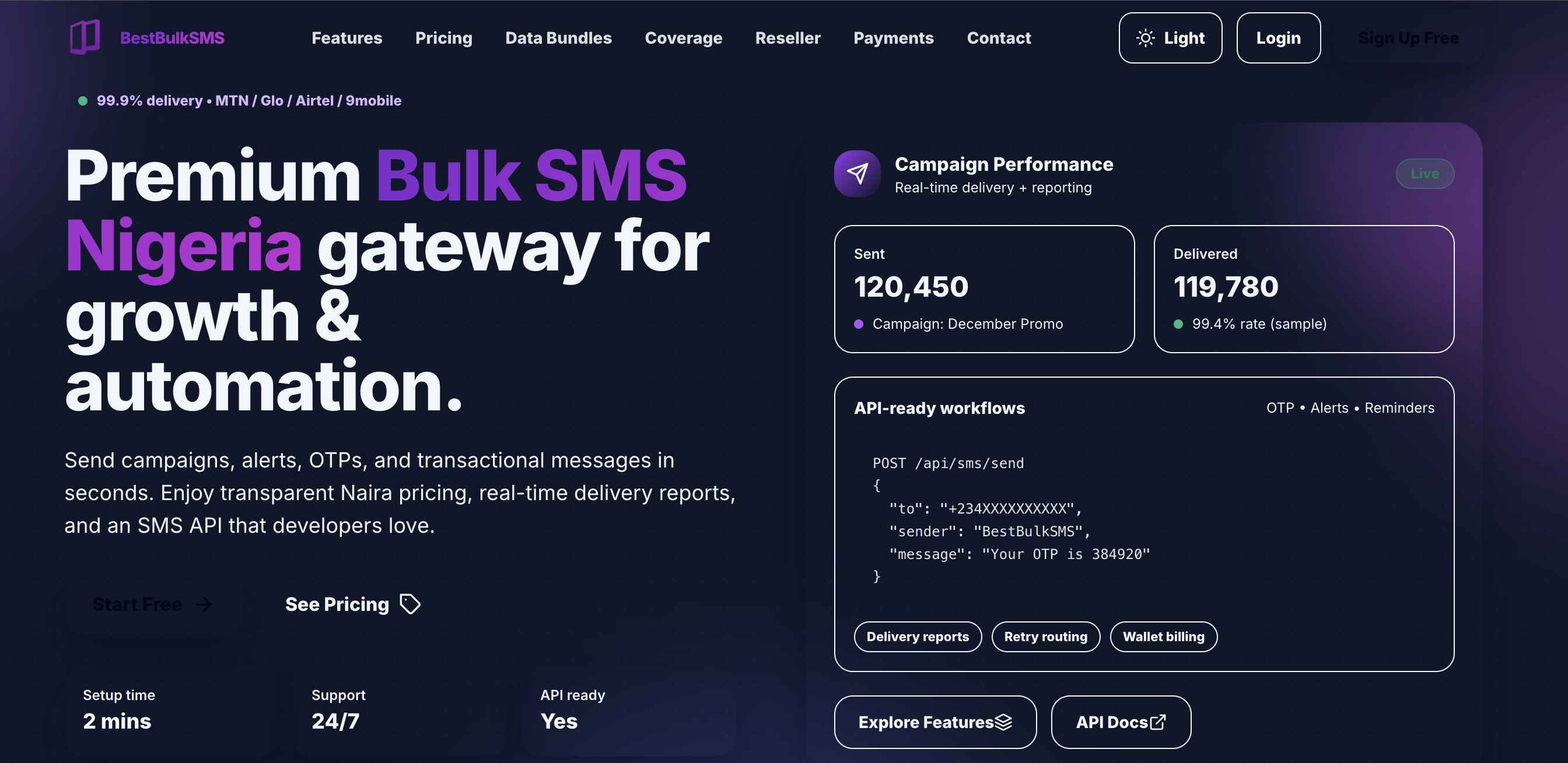 Transactional + bulk messaging with routing, templates, scheduling, and analytics—optimized for reach.